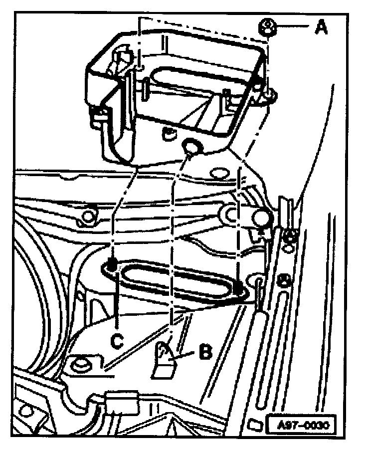 - Push housing to rear (into plenum) to disengage from retainer bracket -B- and remove housing.