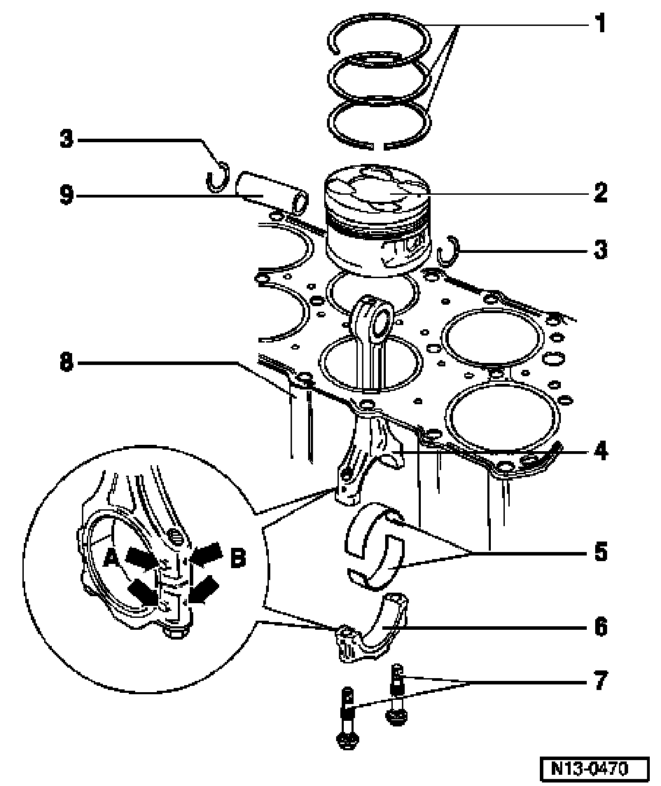 Note: If a new installation tool (funnel) is used to install the pistons, first pass piston with oiled piston rings through the funnel twice and remove the resulting metal shavings if necessary. Only then install piston with piston rings.