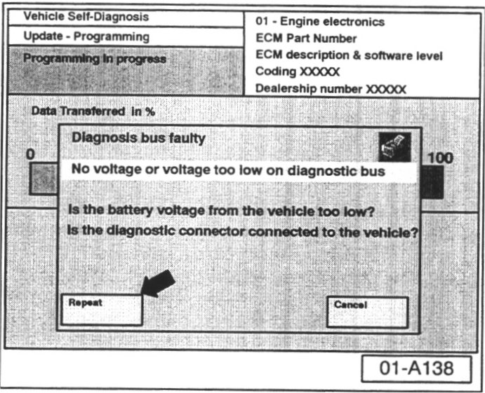 - The "Update - Programming" (flashing) process must then be started from the beginning using the "Repeat" button (arrow) DO NOT use the "Cancel" button.