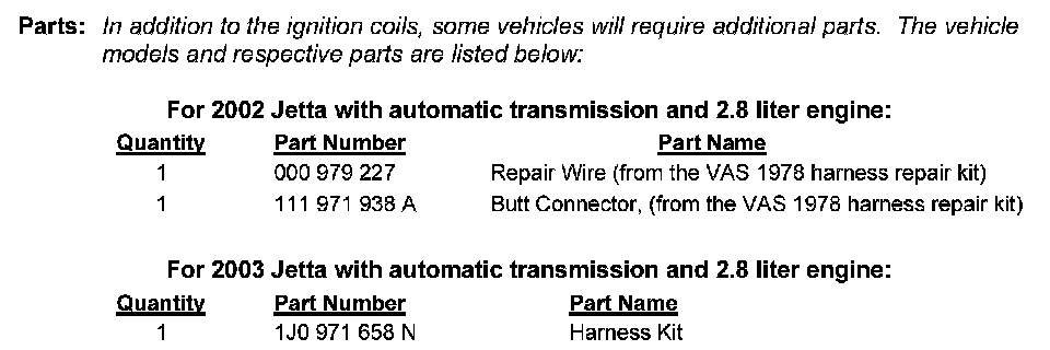 Objective: This procedure describes changing the ignition coils on 1.8 liter & 2.8 liter engines in New Beetle, GTI & Jetta vehicles, a wire harness modification for 2002 & 2003 Jetta vehicles having a 2.8 liter engine with an automatic transmission, changing the ignition coils on 1.8 liter & 4.0 liter engines in Passat vehicles, and on 2.8 liter engines in EuroVan/Rialta vehicles.