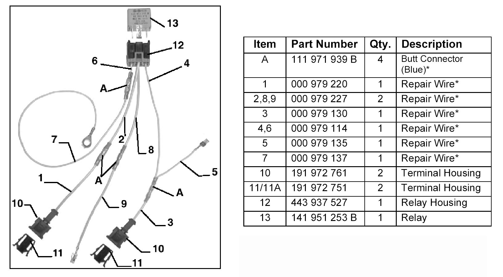 NOTE: If assembled harness kit (1J0 971 658 N) is not available from parts, then the individual parts listed below can be assembled.