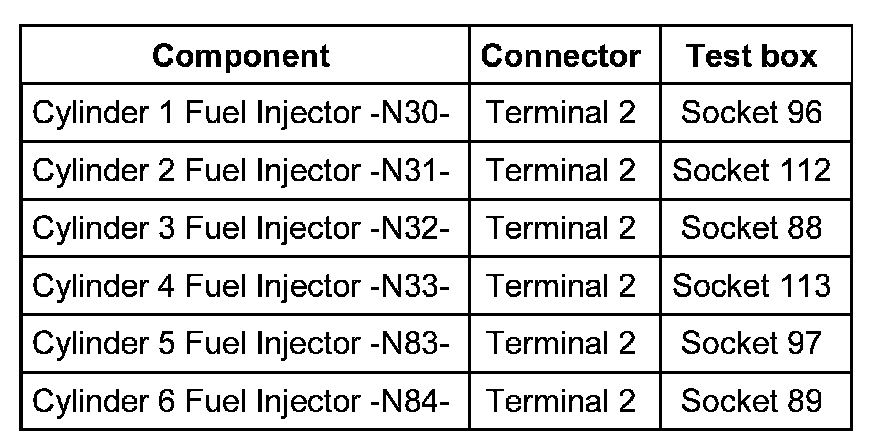 - The respective fuses of fuel injectors (Cylinder 1 Fuel Injector -N30- to Cylinder 4 Fuel Injector -N33-, Cylinder 5 Fuel Injector -N83-, Cylinder 6 Fuel Injector -N84-) must be OK.