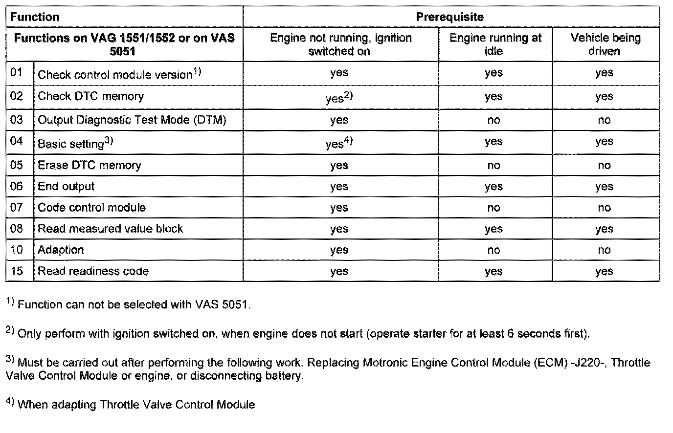 Functions which can be selected when using the VAG 1551/1552 or VAS 5051 scan tools