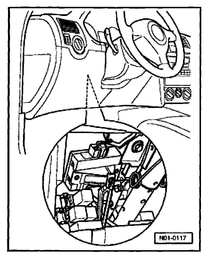 The central locking control unit (J379) is located under the dash panel and is secured by a bracket to the steering column. It is equipped with a DTC memory. The On Board Diagnostic (OBD) connection is located under the driver's knee bar to left of the steering wheel.