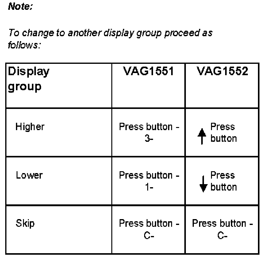 The measuring value block is divided into 15 display group numbers. The assignment of the individual display fields can be found in the display group overview.