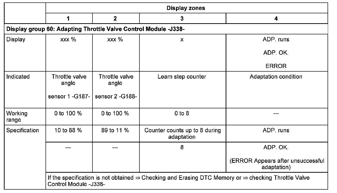 The adaptation teaches the Motronic Engine Control Module (ECM) -J220- the various positions of the throttle unit when the ignition is switched on and the engine is not running. These positions are stored in the control module. The feedback of the throttle valve position is via both angle sensors for throttle valve drive.
