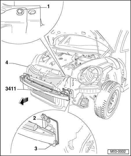 - Remove one bolt each - 2 - from longmembers and bolt in Support Tool 3411 at right and left longmembers for this.