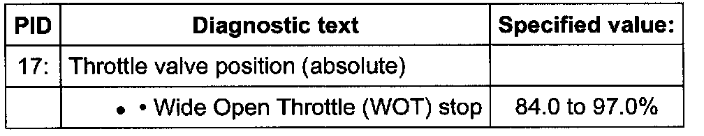 - Check specified value of throttle valve position (absolute) at Wide Open Throttle (WOT) stop: