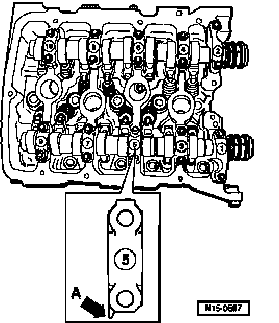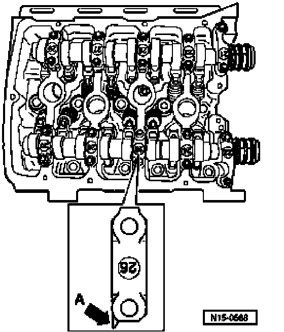^ Place respective camshaft carefully in camshaft bearings of cylinder head, observing camshaft identification.