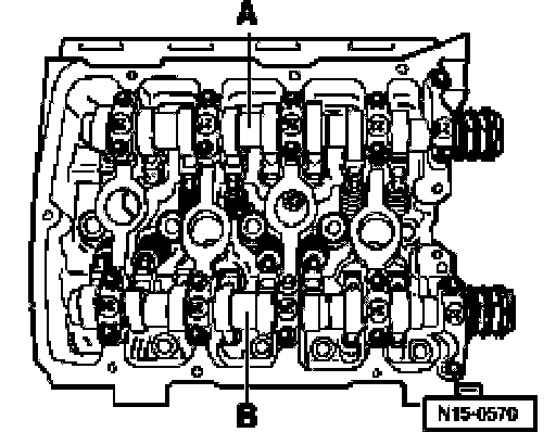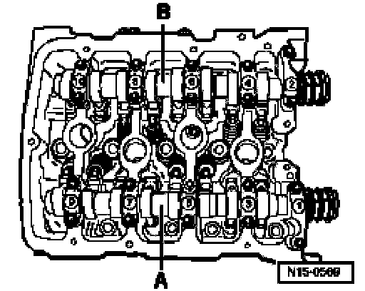 ^ Points of bearing caps -A- of intake and exhaust camshafts face outward.