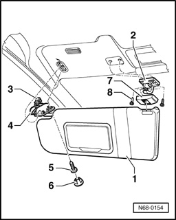 - Unhook sun visor - 1 - out of mount - 2 -.