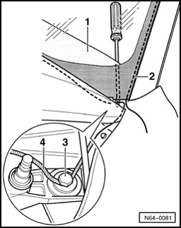 - Push cutting cord through adhesive sealant into vehicle interior using Awl V.A.G 1474/2 (from Separating device for bonded windows V.A.G 1474 A). Cutting cord is doubled up to windshield wiper axle.