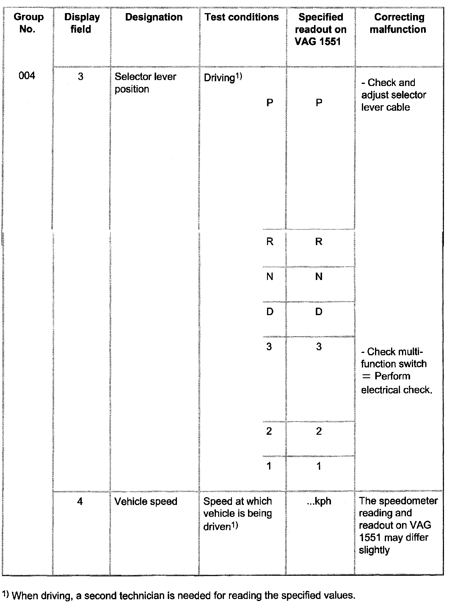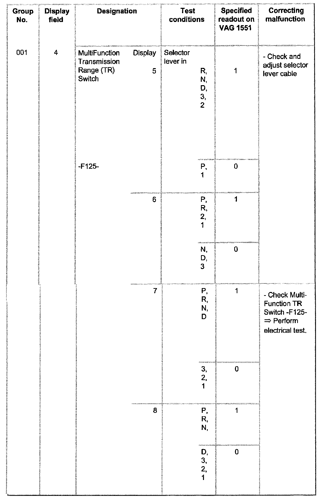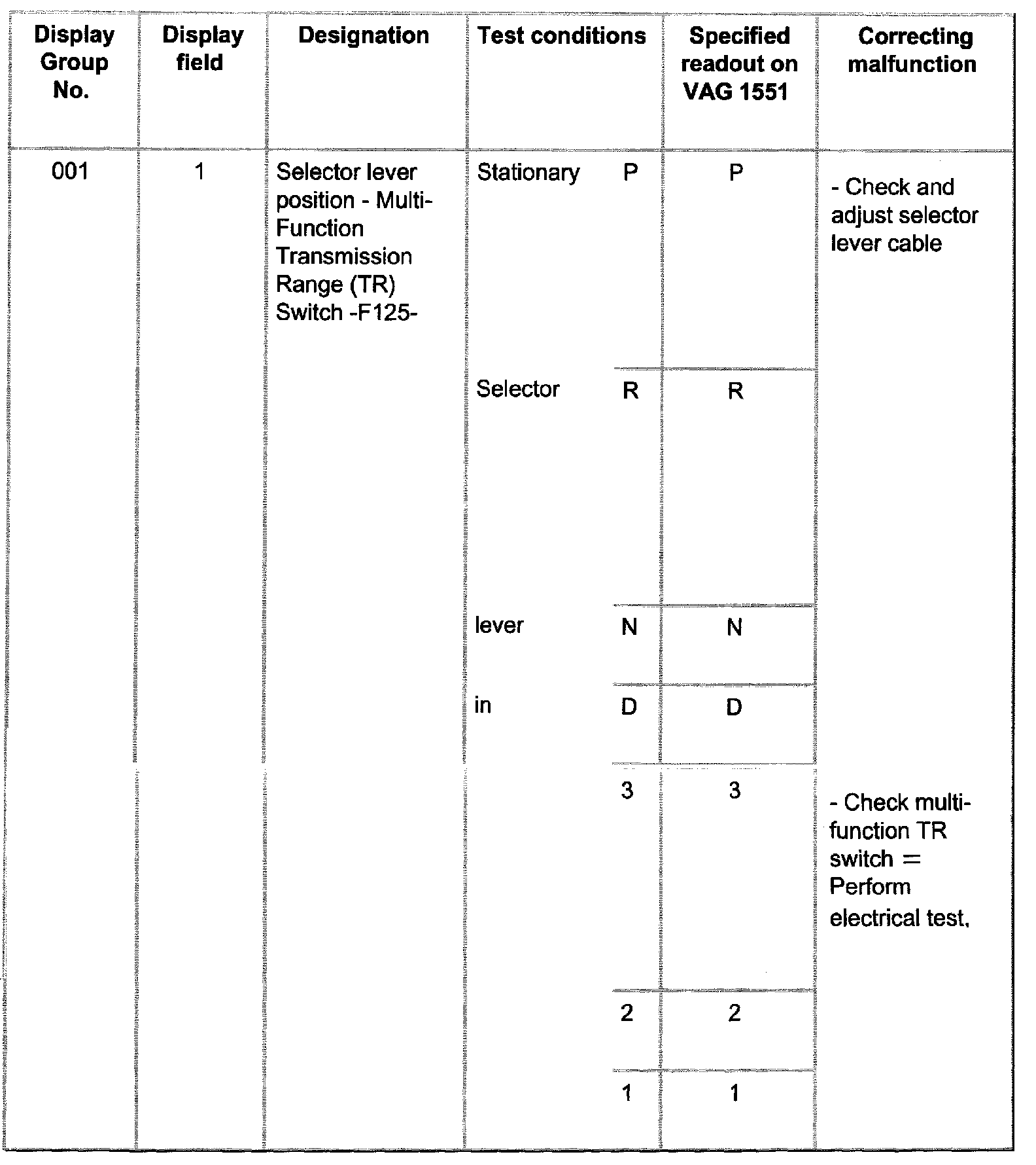 - The table shows the solenoid valves -N88-, -N89- and -N90- (displays 1 to 3) as activated in each selector lever position. These solenoid valves control the shift valves for the relevant gears.