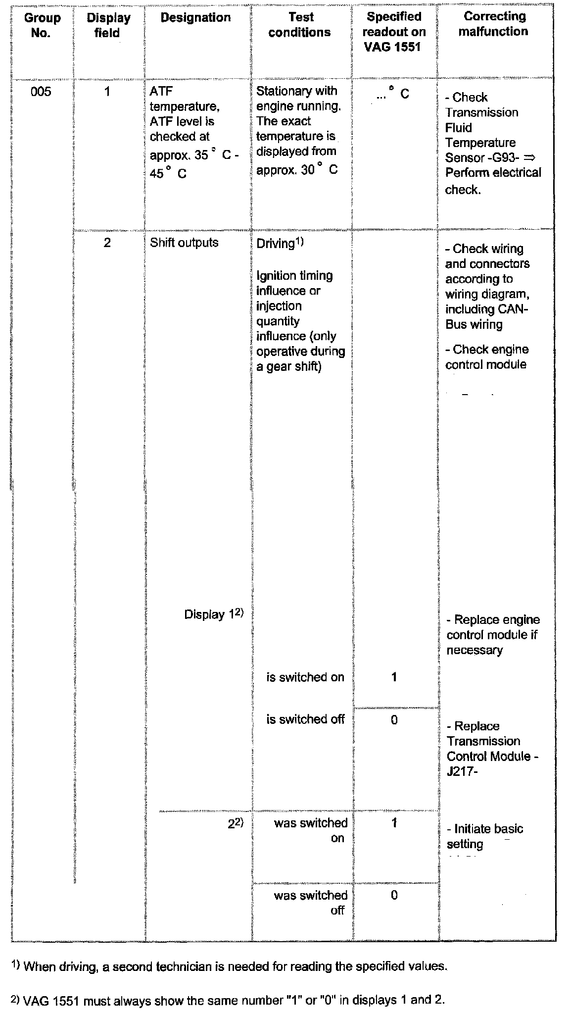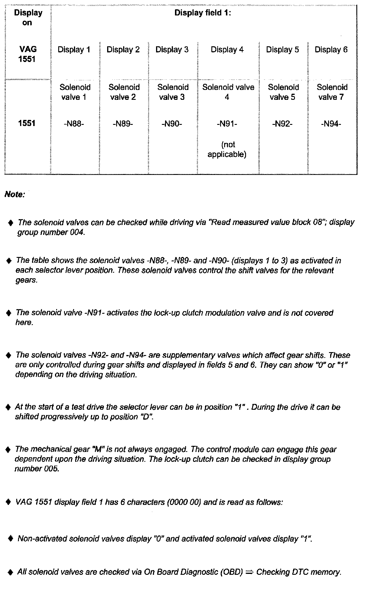 - The solenoid valves -N92- and -N94- are supplementary valves which affect gear shifts. These are only controlled during gear shifts and displayed in fields 5 and 6. They can show "0" or "1" depending on the driving situation.