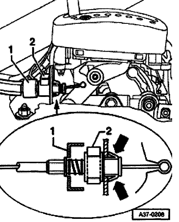 - Press locking cable into support bracket on selector lever housing until tabs on retaining clip -arrows- spring outward.