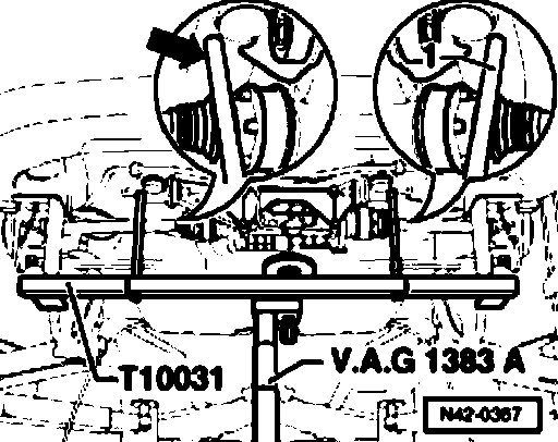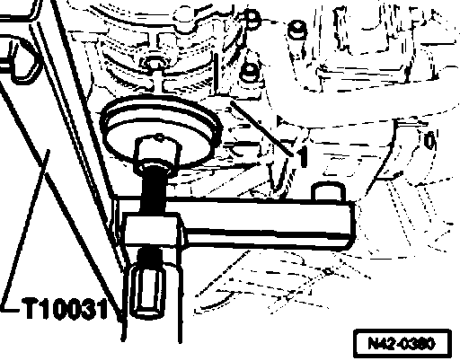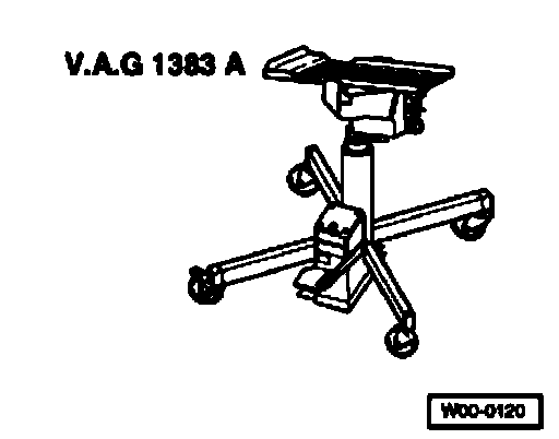 ^ Engine and transmission jack V.A.G. 1383 A with universal transmission mount V.A.G. 1359/2