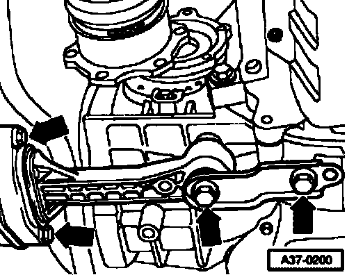 - Unbolt transmission side of assembly mounting from top of transmission carrier (arrows).