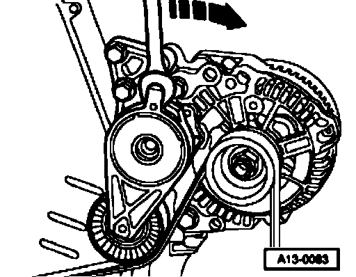 - Turn tensioning device in direction of (arrow) to relieve tension on poly V-belt.