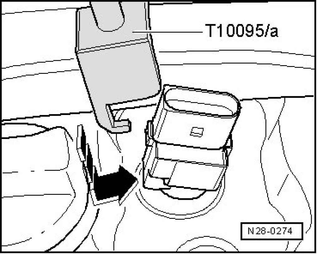 - Slide on the puller for ignition coil -T10095 A- from the straight connector side in the -direction of the arrow- and press the ignition coil with power output stage onto the spark plugs.