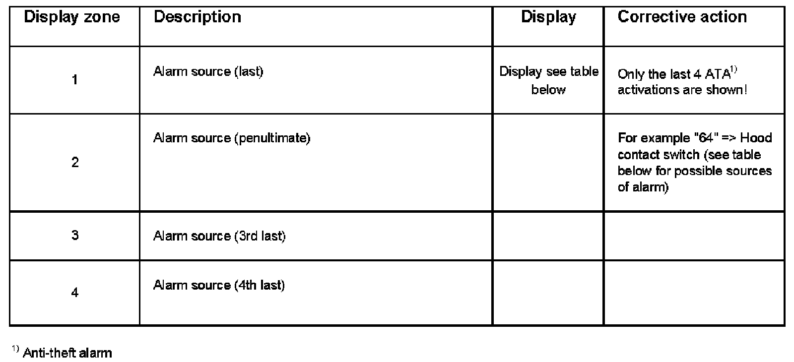 Possible sources of alarm Display