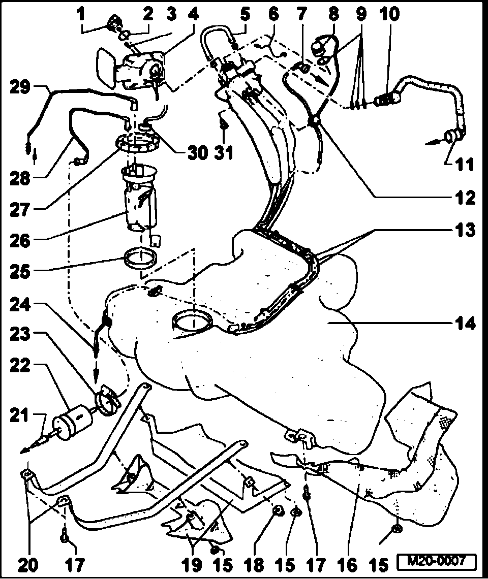 Fuel Tank With Attachments And Fuel Filter, Removing And Installing