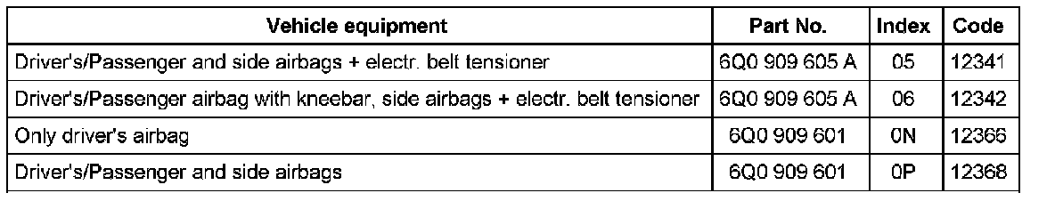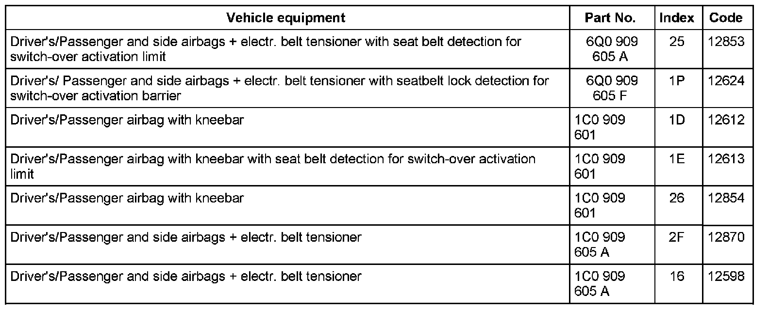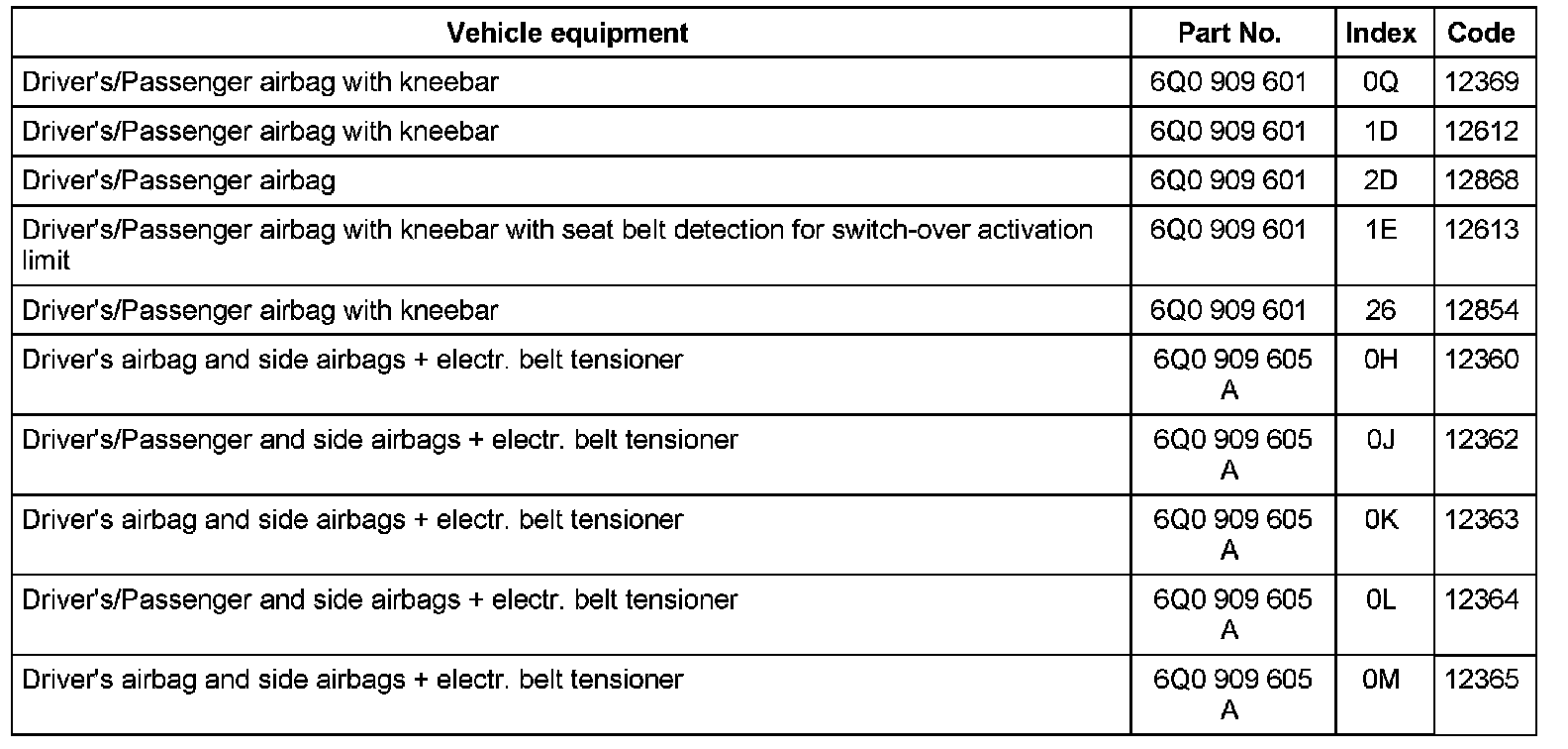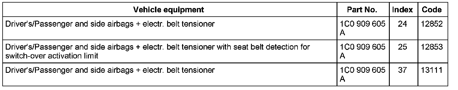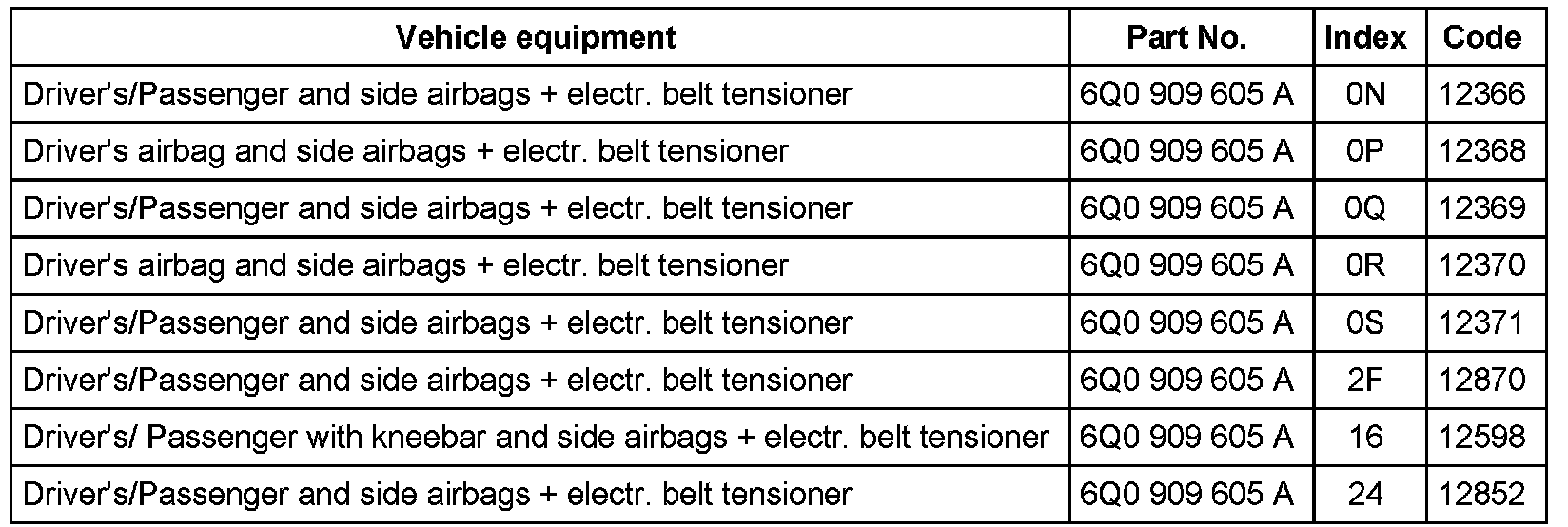 NOTE: Airbag Control Module -J234- current coding numbers can be found in the Vehicle Diagnosis, Testing and Information System VAS 5051.