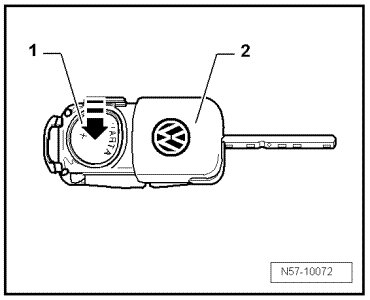 - Slide the battery - 1 - in the direction of - arrow a - and remove it upward - arrow b - from the key - 2 -.