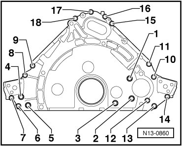 - Tighten the bolts - 1 through 18 - in the sequence shown to 20 Nm.