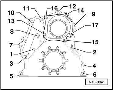 - Tighten the bolts - 1 through 17 - in the sequence shown to 8 Nm.