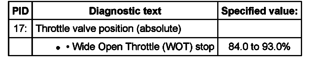 - Check specified value of throttle valve position (absolute) at Wide Open Throttle (WOT) stop: