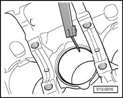 ^ Check radial clearance with Plastigage(R): New: 0.01 ... 0.05 mm; Wear limit: 0.09 mm (Do not rotate crankshaft when checking radial clearance)