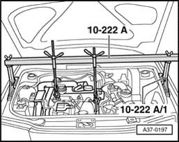 - When loosening the front engine mounting bolt the engine must be raised slightly with the support device.