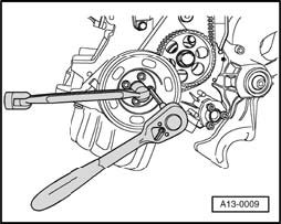 - Loosen camshaft bolt until camshaft sprocket can be turned by hand. Use counterhold tool T10172 with pin T10172/3.