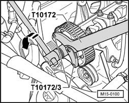 - Hold crankshaft sprocket with counterhold T10172 (pin T10172/3) and tighten camshaft bolt to 40 Nm.