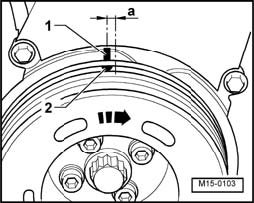 Notch -2- on vibration damper/belt pulley must be positioned -a- (max. 5 mm) after TDC marking -1- on toothed belt guard lower part.