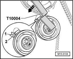 - Tension toothed belt by turning eccentric to left (direction of arrow) with two hole pin wrench (T10004) onto limit stop.
