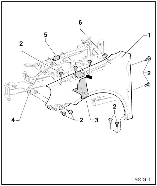 - Pull out foam piece - 3 - between fender and longitudinal member and remove fender - 1 -.