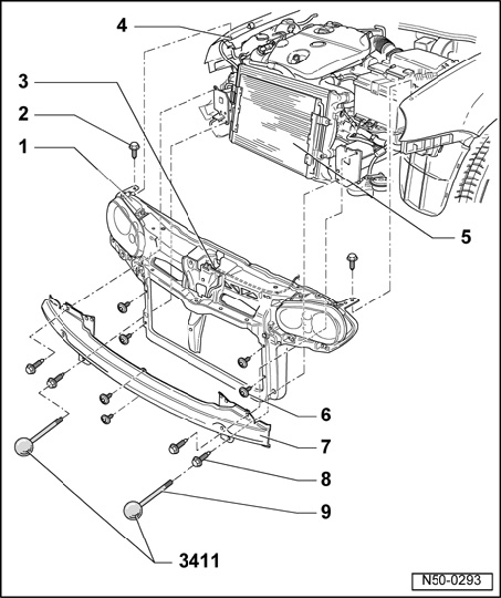 - Remove one bolt each at longmember's and screw in Guide rods 3411 at right and left longmembers for this.