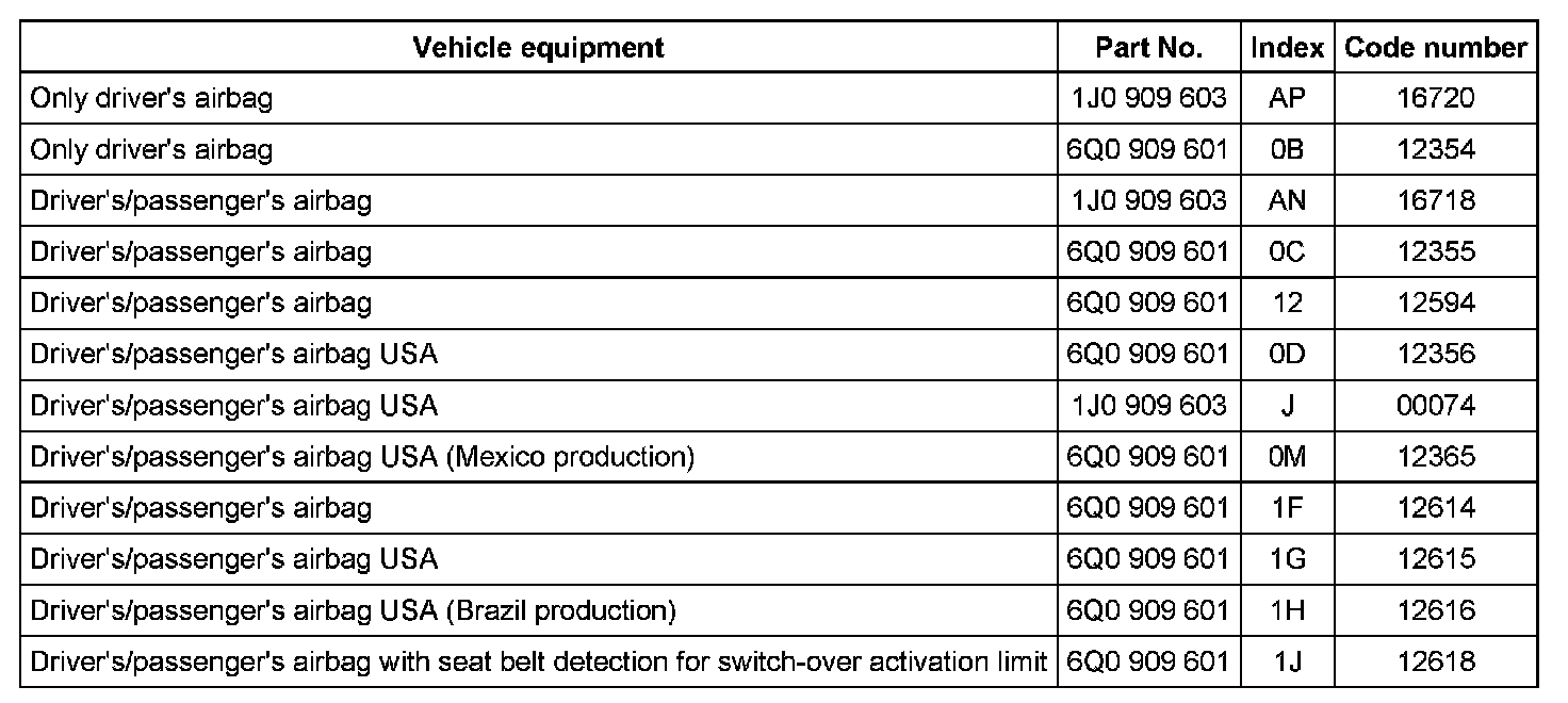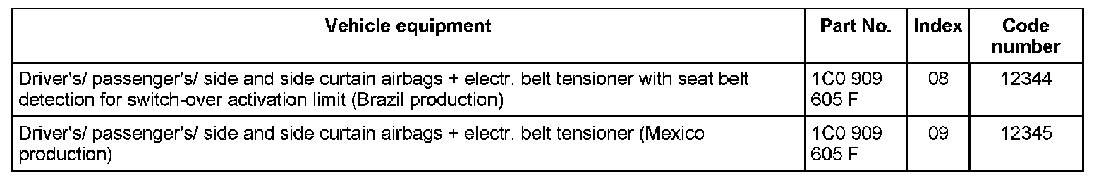 In this case the control module has not been programmed with the relevant data for the vehicle. Coding is then not possible. The Airbag Malfunction Indicator Lamp (MIL) -K75- will not extinguish and lights up continuously. A check must then be completed to see if the correct control module for the vehicle has been installed (compare Part No. and letter index), or whether an incorrect code number has been entered.