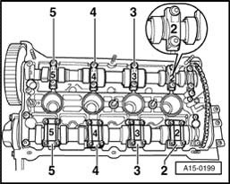 Tighten bearing caps 2 and 4 of intake and exhaust camshafts using a cross-over sequence and tighten to 10 Nm (observe dowel sleeves).