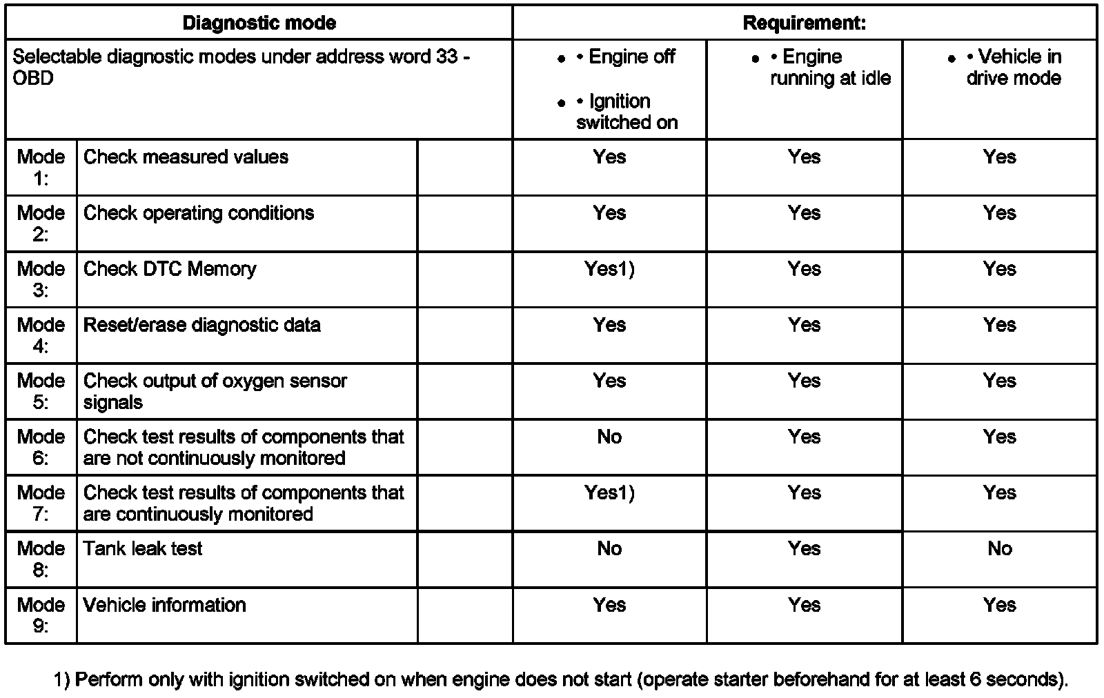 The conditions required for selecting the desired diagnostic mode are listed in the following table: