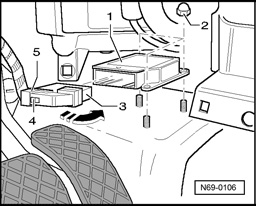 - Press retaining tab - 4 -, swing bracket - 5 - - arrow - and pull harness connector - 3 off control module - 1 -.