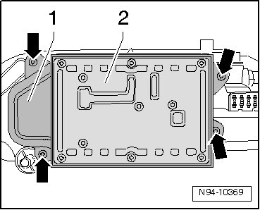 - Remove mounting bolts - arrows - and pull off bracket - 1 - with HID lamp control module - 2 - as far as wire lengths allow from headlamp.