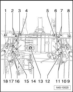 - Remove pendulum support from transmission, to do so remove bolt - 14 -.