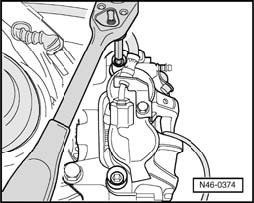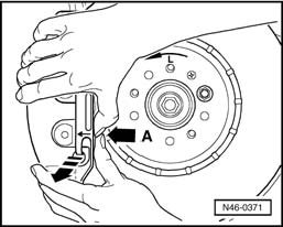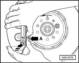 - Press retaining spring so far in direction of (arrow -A-) until it can be pressed out of the bore of the brake caliper.