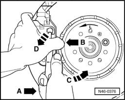 - Then, pull bottom of retaining spring in direction of (arrow -A-) and hold this position. Now press top of retaining spring in direction of (arrow -B-). At the same time, the retaining spring must be turned slightly counter-clockwise and be pulled out of the bore of the brake caliper (arrow -D-).