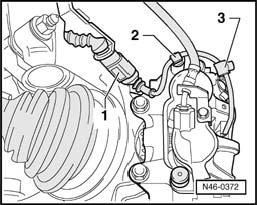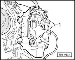 - Remove harness for brake lining wear indicator from retainer -2- of the upper cap and out of retainer -3- of the protective cap.