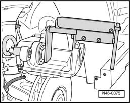 - Place top of retaining spring against brake caliper carrier. Then, press the top of retaining spring in direction of (arrow -B-) and simultaneously hold the bottom in opposite direction of (arrow -A-). Now, press the retaining spring into the bore of the brake caliper.
