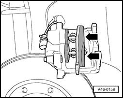 - Place the bottom of retaining spring against brake caliper carrier. Then, press retaining spring in direction of (arrow -A-) first, and then simultaneously into the bore of the brake caliper.