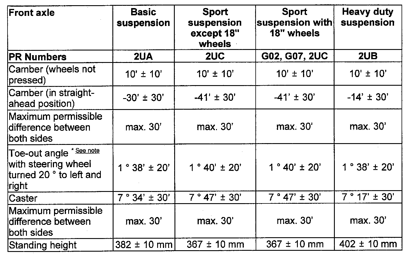 Front Wheel Alignment Specifications